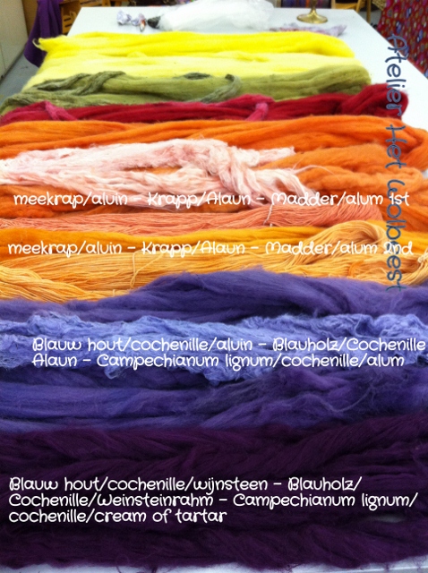We begonnen vroeg, want we hadden veel te doen. Verven met planten is een bewerkelijk proces dat veel tijd in beslag neemt. Vaak moeten de te verven materialen, zoals wol of zijde met een beitsmiddel een uur tegen kooktemperatuur gehouden worden, waarna het verfproces pas echt kan beginnen. Het is overigens ook mogelijk tijdens het verven een beitsmiddel toe te voegen; beide methoden geven een ander resultaat. Daarna moeten de te verven materialen een uur in het verfbad blijven op een temperatuur variërend van 60- 90 C, afhankelijk van het gekozen plantmateriaal. Verven met natuurlijke materialen is een enorm boeiende bezigheid vooral omdat er talloze variabelen zijn die de uiteindelijke kleur bepalen. De hoeveelheid, het soort beitsmiddel zorgt voor een heel andere kleur evenals de temperatuur waarop geverfd wordt of de tijd waarin het plantmateriaal geoogst is. Zoveel mogelijke kleurschakeringen; je zou er haast niet meer van slapen! Wat ik ook frappant vind, is de kleurintensiteit. Het verven met wouw bijvoorbeeld levert een haast lichtgevend kleur op. Kleuren verkregen door natuurlijk verven, werken helend op de ziel en zijn ook altijd onderling te combineren.Genoeg geschreven, beelden zeggen vaak meer.... Fijne zondag!
